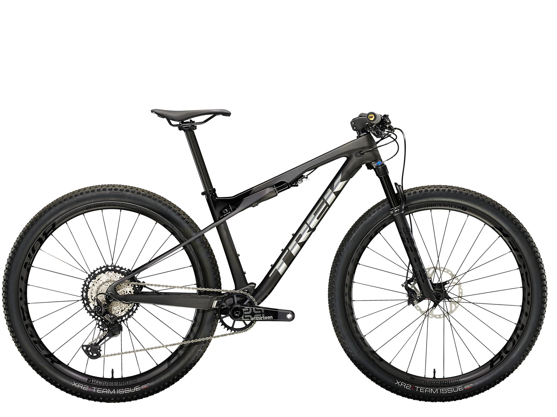 Einen ultraleichten, komplett aus OCLV Mountain Carbon gefertigten Rahmen mit 60 mm Federweg, eine FOX Performance 32 Step-Cast-Gabel mit 100 mm Federweg und Treks exklusiven, speziell für das Supercaliber entwickelten IsoStrut FOX Performance-Dämpfer. Dazu gibts einen Remote-Lockout, die leichtgängigen, präzisen Gangwechsel eines Shimano XT-Antriebs, eine integrierte Bontrager RSL Lenker/Vorbau-Einheit und Bontrager Kovee Pro 30-Carbonlaufräder samt Rapid Drive-Hinterradnabe mit 108 Zähnen für einen verzögerungsfreien Kraftschluss.
