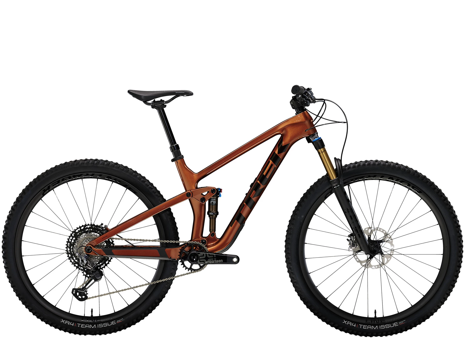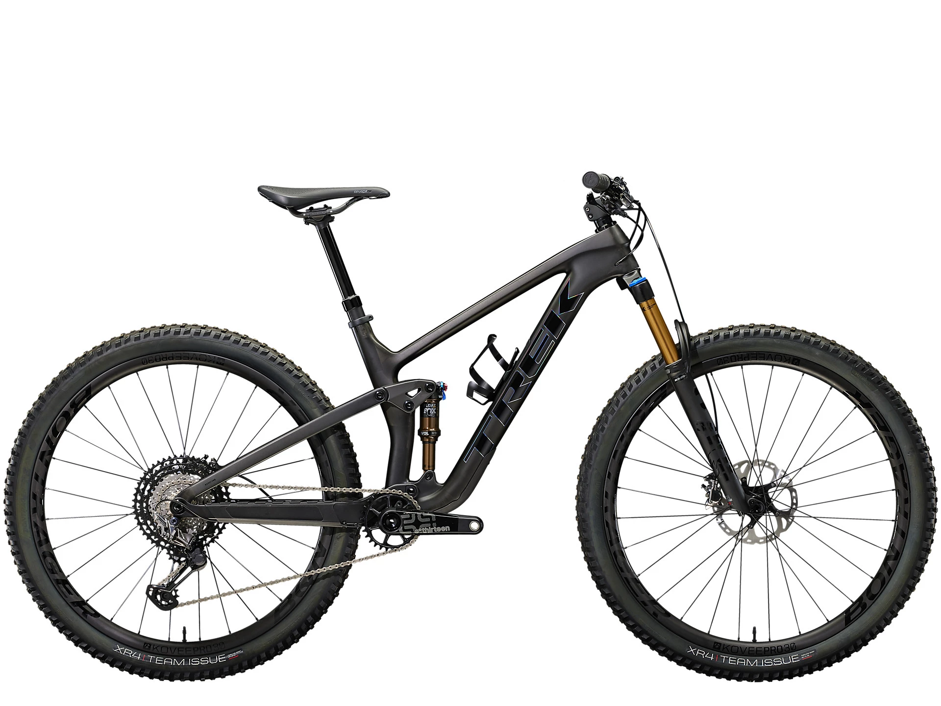 Einen leichten und steifen Vollcarbonrahmen, eine FOX Factory 34 Gabel mit 130 mm Federweg, einen FOX Factory Float-Dämpfer mit 120 mm Federweg und einen geschmeidig schaltenden, präzisen Shimano XTR 1×12-Antrieb. Außerdem kommt es mit breiten Bontrager Kovee Pro 30-Carbonlaufrädern samt Rapid Drive-Nabe mit 108 Zähnen für einen verzögerungsfreien Kraftschluss und ist mit ganz viel Carbon bestückt.