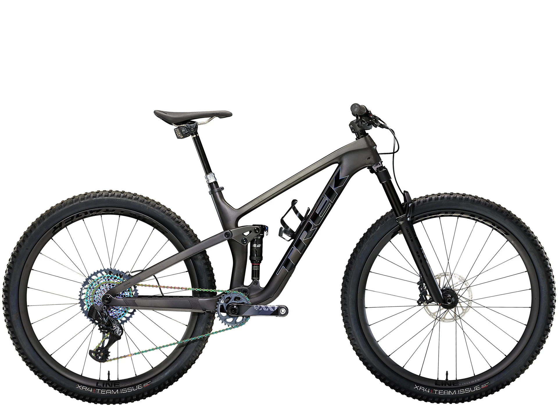 Einen Vollcarbonrahmen, eine extrem geschmeidig arbeitende 130 mm RockShox Pike Ultimate-Federgabel mit Charger 3 RC2-Dämpfer und breiterem Einstellbereich. Dazu bekommst du einen RockShox Deluxe Ultimate-Dämpfer mit 120 mm Federweg und einen komplett drahtlosen SRAM XX1 Eagle AXS-Antrieb. Außerdem gibt es breite Bontrager Line Pro 30-Carbonlaufräder samt Rapid Drive-Nabe mit 108 Zähnen für einen verzögerungsfreien Kraftschluss, eine drahtlose RockShox Reverb AXS-Variosattelstütze und SRAM Level Ultimate-Scheibenbremsen mit Carbonbremshebeln.