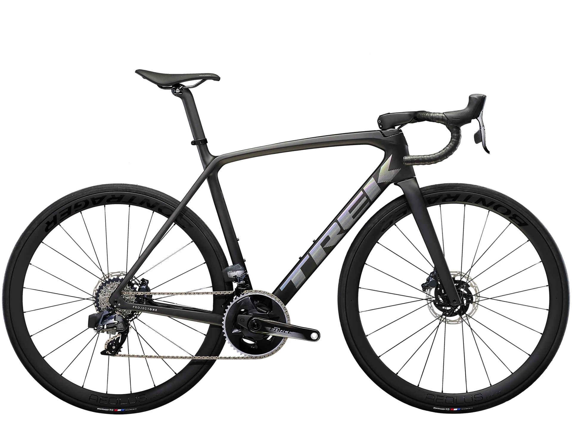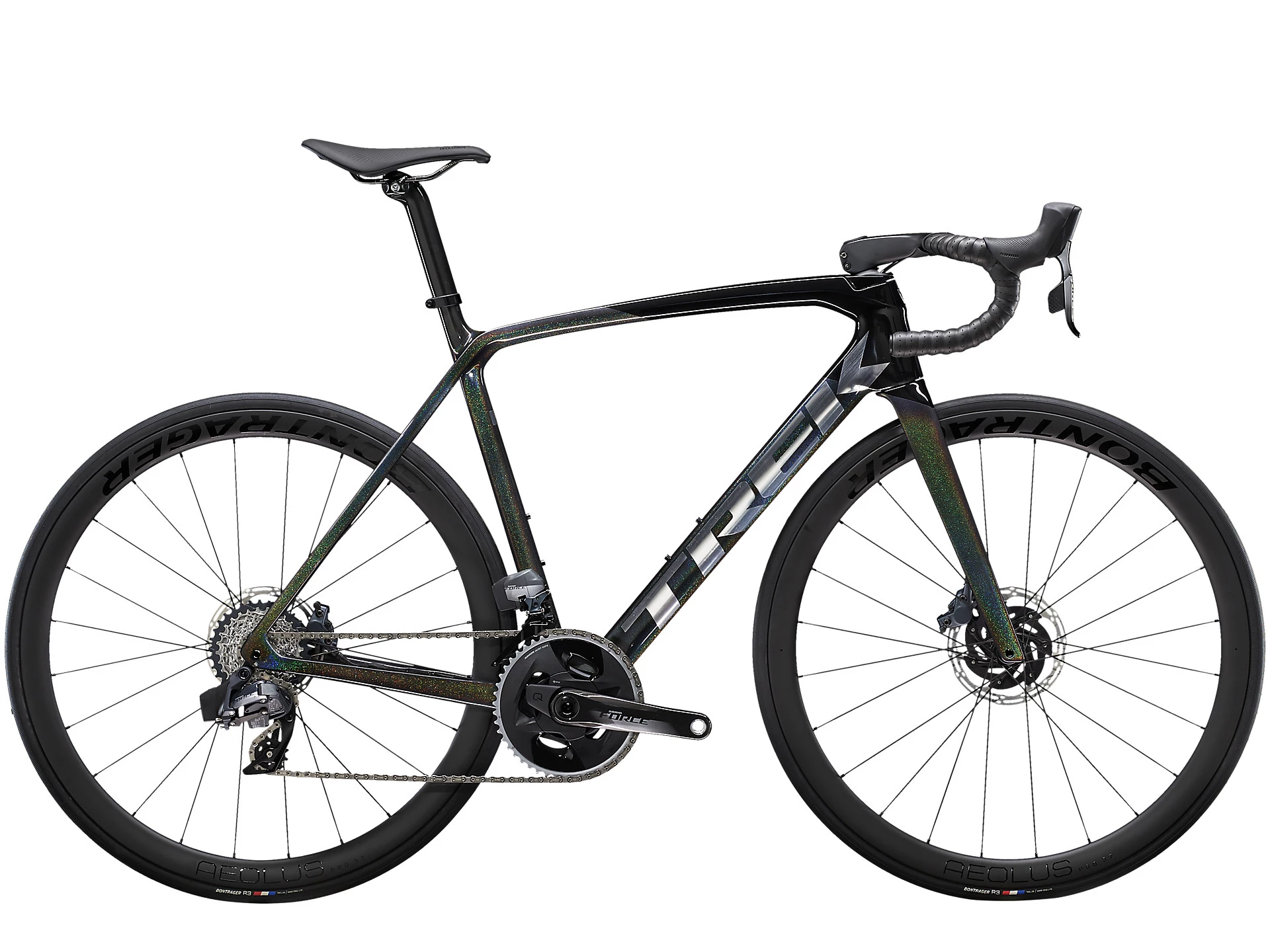 Einen ultraleichten und aerodynamischen Rahmen aus 800 Series OCLV Carbon, der weniger als 700 Gramm auf die Waage bringt, einen SRAM Force eTap AXS 2×12-Antrieb mit drahtloser elektronischer Schaltung, leichte Bontrager Aeolus Pro 37 Tubeless Ready-Laufräder aus OCLV Carbon, eine integrierte Aeolus RSL Lenker/Vorbau-Kombination aus OCLV Carbon, einen SRAM Force AXS-Leistungsmesser und kraftvoll zupackende hydraulische Scheibenbremsen.